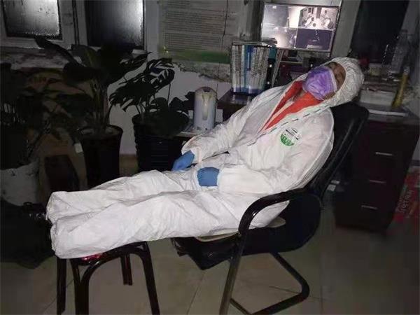 照片中的白衣天使,男的是来自天桥岭林业局职工医院的化验室付金,是这个组的唯一男生,女的是来自职工医院公共卫生科护士王淑英。长时间在室外,为来往车辆上的人员测量体温,身体有些透支,穿着白大褂,带着胶皮手套,穿着鞋,躺在小床上,小睡一会,依然能看清他们疲惫又让人心疼的脸。