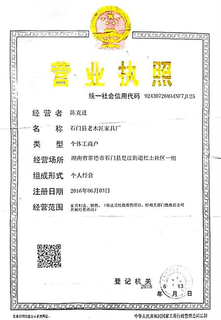 陈克进在外飘泊20多年,也赚了一些银子,2015年他满怀信心地准备在家乡创业,把家迁往宝峰街道新街口准备办厂,占地面积5,5亩,约3000多平方米。2016年办环保炭厂,投资240多万元,可到最后按照环保政策,办不了环保证,无法进行生产。没办法,把基地、机械设备、材料全部卖掉,当时买进来的30多万元的锯末粉,只有卖了3万元,亏人工工资2万多元。使他打伤元气,亏了200多万元。后来他在红土社区租赁厂房,办起了“石门县老木匠家具厂”,刚刚看到一点希望,仿制的明清实木家具销往福建、山东、深圳等地及石门本地区。同时办起了大理石磨石厂,墈地板、灶台、做橱柜等。2024年第一批发给老客户70多万元的条子,只收到3500元。2023年冰灾,生产基地大棚压垮,损失了100多万元。可他并不气馁,他要把他的传承的明清家具发扬光大传承下去。