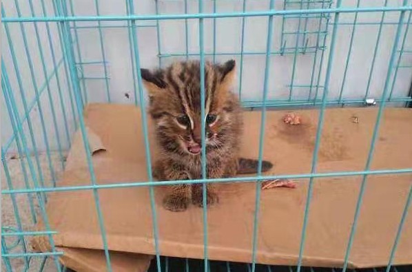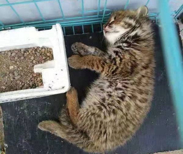 据天桥岭森林公安局森林案件侦查大队指导员赵长义介绍, 2019年 6月27日,天桥岭森林公安局联防防控队在桦皮林场20林班进行巡逻巡护时突然发现路边蜷缩着一只小动物。走进一看,只见这只动物全身毛发灰黑相间,爪子锋利,经辨认是被世界自然保护联盟列成易危物种的豹猫。见有人前来,动弹不得的“小家伙”吓得瑟瑟发抖。