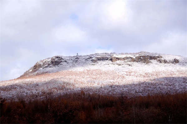 10月26日、汪清县磨盘山を歩いた。延吉は前日の夕刻より雨だったが朝には止んで冷え込んでいた。車が汪清县の目的地に差し掛かると車中から見える磨盘山は冠雪していた。車中で歓声を上げた。雪を頂いた磨盘山は美しく、雪山登山への期待を抱かせた。