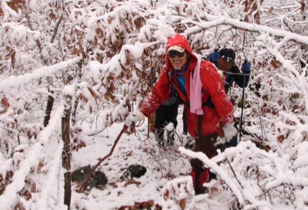 今年初めての積雪登山だった。我々は西側斜面から登った。緑の松葉や紅葉に被さる雪景色が美しく心もウキウキした。