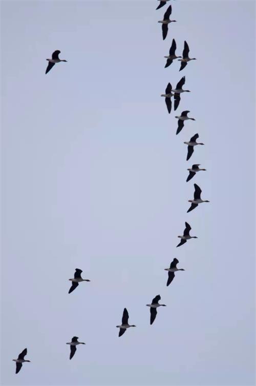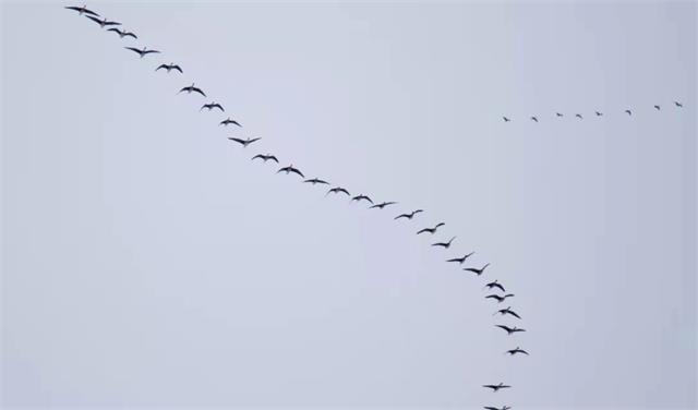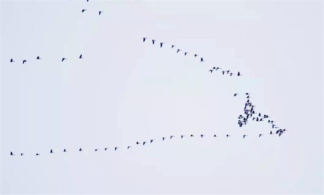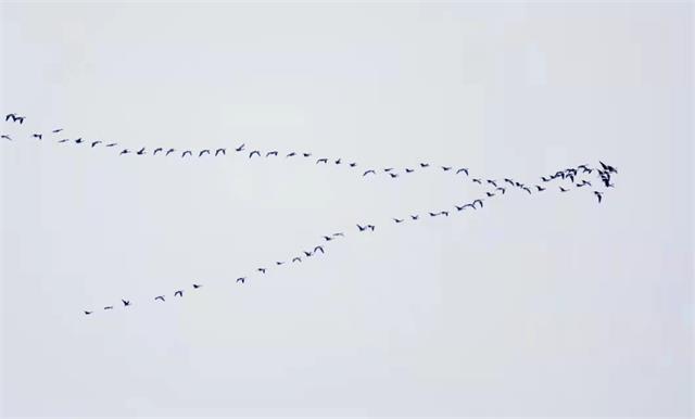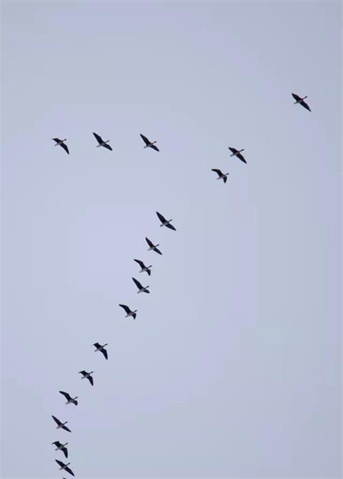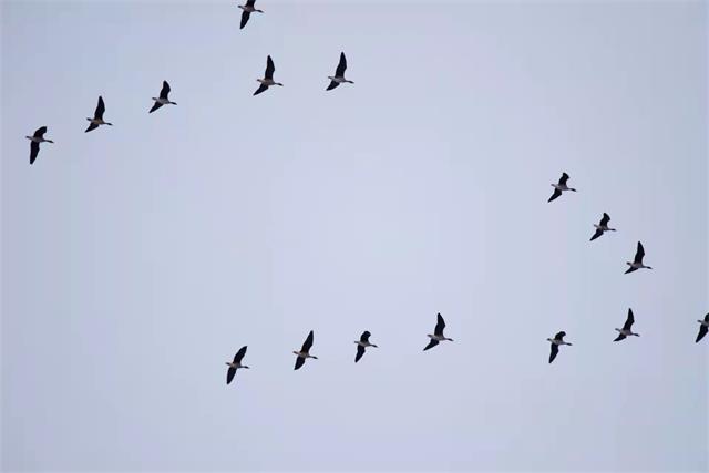 3月18日早6点左右,天桥岭上空接连飞过一群群的大雁,这些大雁在空中队形整齐、造型各异,有大队、有中队、有小队,雁群们在迁徙的季节,常集成数十、数百甚至上千只得大群,并由一只有经验的头雁领队飞行,它们时而排成“人”字,时而排成“众”字,时而排成“一”字向北飞去,场面十分壮观,展现出一幅幅大美的生态画卷,一时之间,吸引不少群众驻足观看。