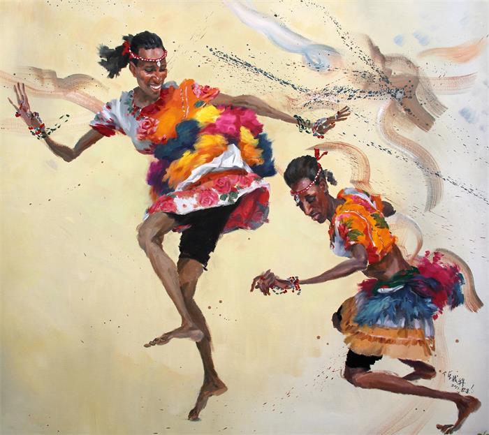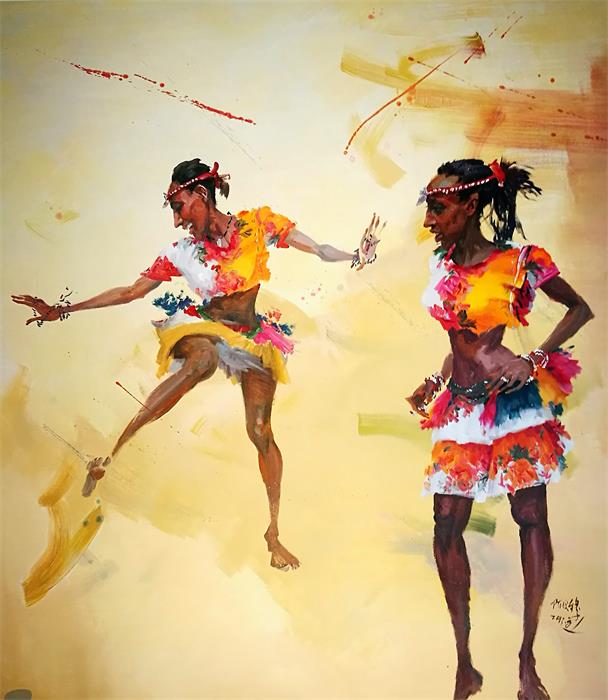 那些颇具性情的笔触,时而如猿群腾挪高跃,时而如风拂树梢一掠而过,惬意轻松, 画笔是那样极具把握地挥洒出画家对非洲文化的理解与欣赏,它们带著画家和画中人同歌共舞,其形通过意交融的意境。正如南田所说:曲终人不见,化作彩云飞。中国人民大学徐悲鸿艺术研究院院长徐庆平也说:“我们能从他的画中感受到学院系统严谨的教育对他形成自己画风的影响和帮助,同时也能从中品出他对艺术门类触类旁通的掌控能力和进行艺术创作时奔流的激情与想象。”