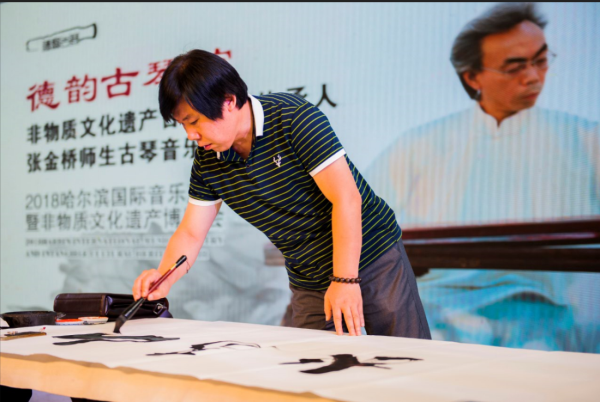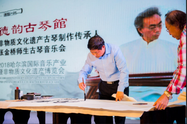 一场别开生面的琴书雅韵,与古人对话的艺术盛宴在c区的主舞台现场上演。由黑龙江德韵古琴文化研究院院长、黑龙江德韵古琴创始人、古琴制作非物质遗产传承人张金桥先生,北京紫禁城书画院院长、中国国家博物馆特约画家贾玉富,中国书法家协会会员、宜兴市古琴协会会长戴静波,哈尔滨书画院院长、黑龙江省书协理事王显君,黑龙江经济报编委、黑龙江省美协理事刘纯等几位大师共同完成,演绎了一场复古的文化盛宴,吸引了众多观众驻足。