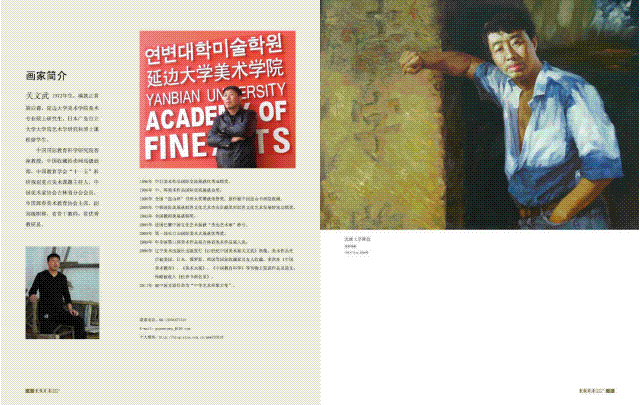 关文武老师2013年毕业于延边大学美术学院,获艺术硕士学位,现为珲春市教师进修学校美术教研员。吉林省基础教育 科研美术资深专家、吉林省基础教育科研“关文武专家工作室” 主持人。吉林省美术学科骨干教师、吉林省美术学科带头人。近几年来潜心教学,他曾获全国美术课堂教学专题展评课一 等奖,省教育厅举办的省艺术节优质观摩课评选活动一等奖,并 且多次在省、州、市开设摩课,受到一致好评。主持和参与省 级以上课题结题十项,省级以上刊物发表教育教学论文二十多 篇,出版有(21世纪中国美术家关文武)美术专著。指导青年教师工作。在教研和"关文武专家工作室”工作中。 指导青年教师参加各类教学比赛,省优质课获奖5人次,州、市 优质课获奖16人次。工作室成员1人获省美术学科教学精英, 7人成长为延边州“骨干教师”。他曾先后到三家子满族乡学校 支教,延边大学师范分院对口支援。他的学生多人考入"211" 院校的研究生。2018年被聘为延边大学美术学院兼职教师。 2021年被聘为全国中小学责任教育联盟副秘书长。他的美术创作历程在中央电视台、风凰卫视等媒体播放。他 的油画作品展,受到省、市多家自媒体的关注。“教研员关文武 一多彩世界”专题在珲春电视台中俄之桥栏目播放,深受社会的广泛好评,为扩大珲春市的影响力和知名度,做出了积极的贡献。被吉林省书画联盟,授予“吉林省书画教育领军人物”称号。