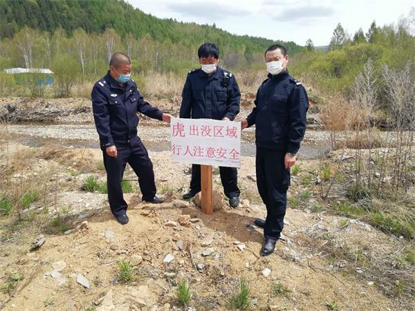 针对眼下正值林场职工等摘山野菜的季节,上山人员较多的情况,为防止虎豹伤人的事件发生,派出所立刻组织民警设置了警示牌,提醒入山人员提高警惕,结伴而行,禁止下套和非法狩猎。