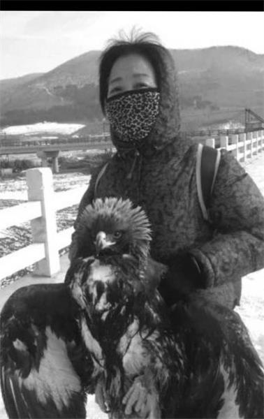 退休女工赵玉兰下午一点来钟去东山打水,看见大河边有一只大鸟,浑身发抖,在冰上一蹦一蹦。大鸟尾巴上冻满了冰溜子,飞不起来。她说,她曾参加过天桥岭森林公安局开展的野生动物保护普法宣传活动,她认为她有义务保护野生动物,于是就把大鸟送到了森侦大队。随后,民警将大鸟带回办公室,并找来水和食物喂食。经鉴定它是国家一级保护动物金雕。