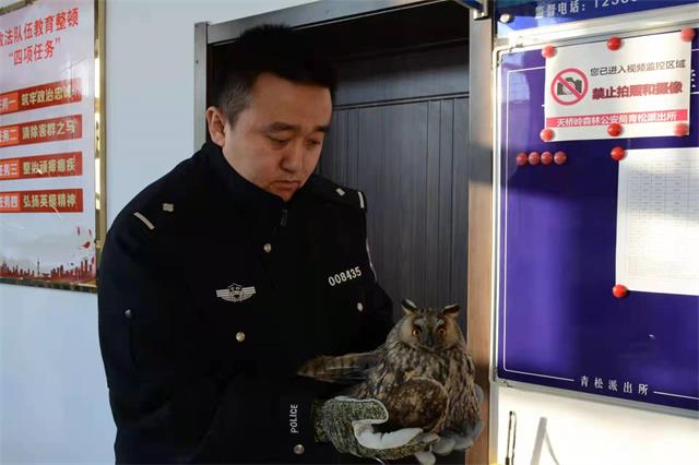 当日,从事道路养护工作的董某,在上班途中发现一只猫头鹰趴在路边一动不动,董某上前查看后发现猫头鹰羽毛上有血迹,一只翅膀已折断情况。随后董某将其抱起放到养护车上,并联系朋友关某询问如何救助猫头鹰,二人一起将受伤猫头鹰送到天桥岭森林公安分局。民警在接受受伤猫头鹰后,及时与天桥岭林业局动保工作人员取得联系,经工作人员鉴定,受伤的猫头鹰属于国家二级保护动物,别名鸮或枭,其面貌像猫,因此得名猫头鹰。这只大眼萌猫头鹰来到派出所后,耳朵竖得像天线吗,瞪着铜铃般的大眼睛,眼神里充满了惊恐和好奇。为帮助猫头鹰尽快恢复体力,民警买来火腿肠掰碎喂其进食,可猫头鹰却用灵活的舌头将民警喂进嘴里的火腿肠弹出,瞪着灵动的大眼睛看着民警拒绝食用。民警又到食堂找来一些鲜鱿鱼,洗净切碎尝试着再次喂食,没想到猫头鹰居然开心的吃起来,这情况让民警一阵无语,原来这“哥们”是挑食啊!喜欢没有污染的食物。24日早,猫头鹰体力恢复,动保处工作人员将猫头鹰送到延边野生动物收容救护中心进行专业救治。