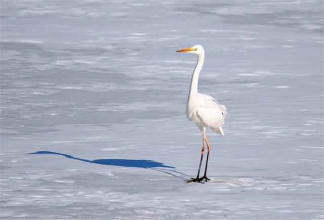 中白鹭静静的站立在初融的冰面上,似等待、似寻觅,洁白的身躯仿若与冰面融为一体,被夕阳拉长的身影仿佛诉说着无限的惆怅。“那雪白的羽毛,勾勒出流线型结构,那橘黄色的长喙,青色的脚,增之一分则嫌长,减之一分则嫌短,素之一分则嫌白,黛之一分则嫌黑”。灵动的眼眸晶莹剔透,从容的姿态,如同一位披着白纱的斯文少女文静优雅。见到堤坝路上有行人路过,警惕的中白鹭立即腾空远离,飞向岸边融化的河面,双脚踏在清澈的河水,慢慢伸展开洁白的翅膀,低头紧盯河面、伺机而动,为捕食河里的鱼虾做足准备,行走间犹如林间精灵,舞动的翅膀迎风飘洒着春的音符,有没得飞姿与嘎呀河的水墨画相应成趣。