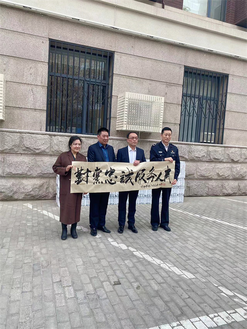 中建二局著名书法家朱广明(左二)老师饱含热情书写了“对党忠诚服务人民”表达了对首都铁警的崇敬之心。