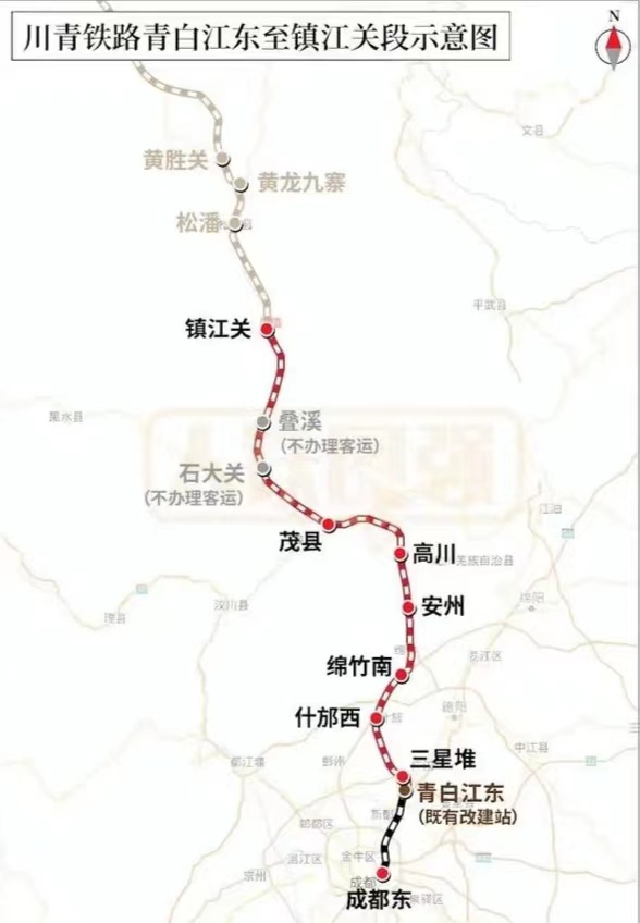 此次开通的为青白江东至镇江关段,自此,成都东站至三星堆、绵竹南、茂县、镇江关站,最快分别18分钟、31分钟、55分钟、86分钟可达。