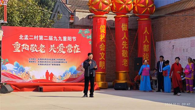 龙虎庄乡北孟二村党支部书记村委会主任 曹俊来 今年是我们村第二届九九重阳庆祝活动,我们会继续坚持下去,在全村弘扬尊老敬老的风气,让尊老敬老成为时尚,做到人人尊老、人人敬老,打造文明、幸福、和谐的村街。