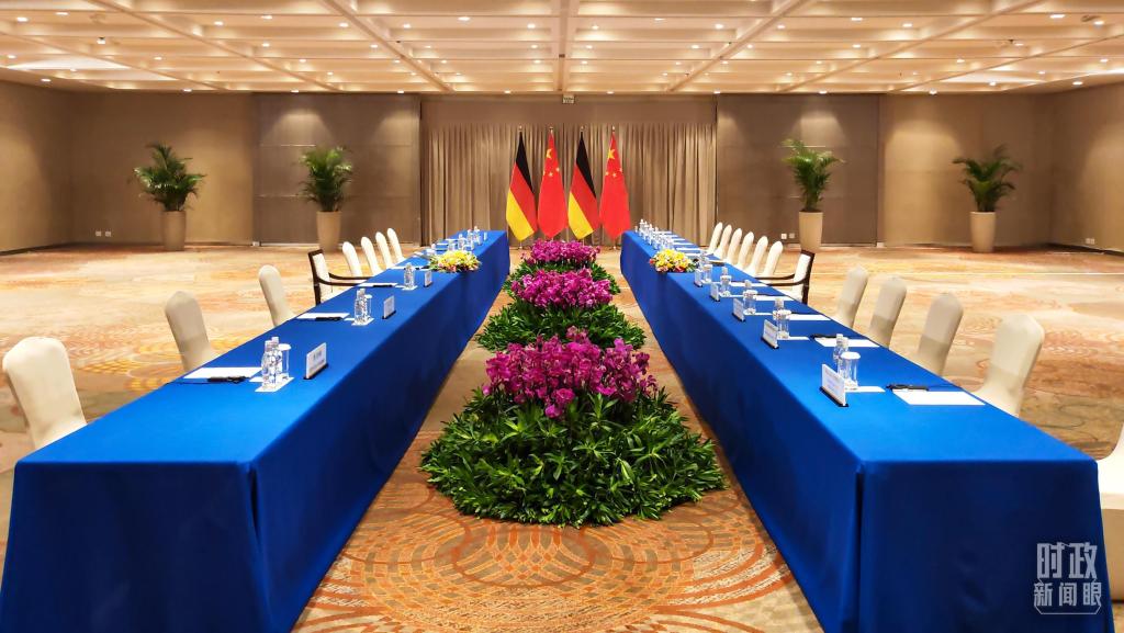 会见现场的中德两国国旗。(总台央视记者李增仁拍摄)