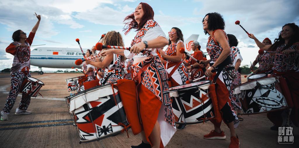 习主席乘专机抵达巴西利亚,艺术家演奏特色鼓乐。(总台央视记者彭汉明拍摄)