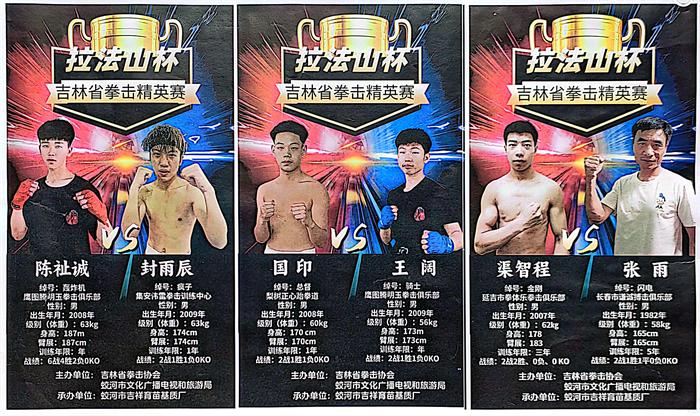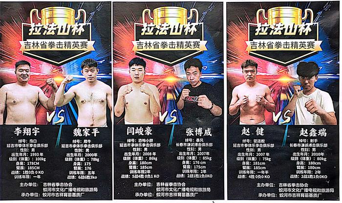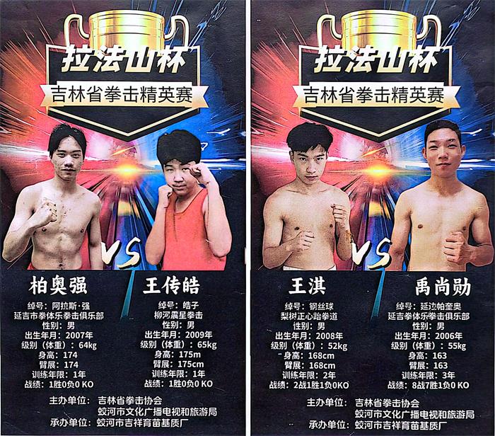 延吉拳体乐拳击格斗俱乐部禹尚勋对决梨树正心跆拳道馆王淇、延吉拳体乐拳击格斗俱乐部渠智程对决武动人生俱乐部张雨、集安伟雷拳击训练中心封雨辰对决鹰图腾明玉拳击俱乐部陈祉诚、梨树正心跆拳道馆国印对决鹰图腾明玉拳击俱乐部王阔、延吉拳体乐拳击俱乐部柏奥强对决震星拳击俱乐部王传皓、强者荣耀拳击俱乐部王思懿(女)对决梨树正心跆拳道馆刘桐菲(女)、延吉拳体乐拳击格斗俱乐部罗强对决梨树正心跆拳道馆李尚恒、伟雷拳击训练中心金晖城对决武动人俱乐部生赵子粮、延吉拳体乐拳击格斗俱乐部赵健对决武动人生俱乐部赵鑫瑞、延吉拳体乐拳击格斗俱乐部闫峻豪对决武动人生俱乐部张博威、延吉拳体乐拳击格斗俱乐部李翔宇对决延吉拳体乐拳击格斗俱乐部魏家平。
