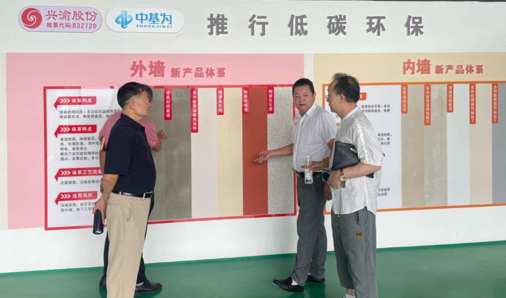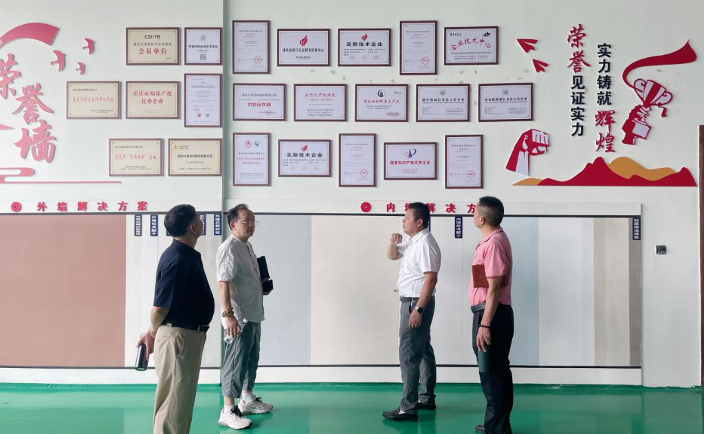 调研期间,谢方奎董事长详细介绍了公司在生态环保材料领域的突破性进展。兴渝科技目前已获得60余项发明专利,被评为“国家知识产权优势企业”,其多款产品于2023年通过重庆市建设领域新技术认定,包括多功能找平保温腻子、建筑外立面修复涂料、疏水质感涂料、水性耐污疏水涂料等,成为重庆市建筑领域推荐使用产品。此外,公司产品积极贯彻绿色环保理念,荣获中国环境标志产品(十环认证)及中国绿色建材产品三星认证,体现了企业对社会可持续发展和生态保护的高度责任感。