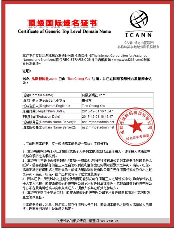 鳳凰新聞社註冊證書