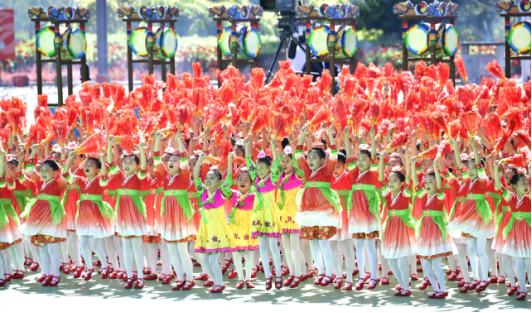 随后,庆祝大会举行了《祝福延边》群众文艺表演。表演分为序幕《鼓舞延边》和《难忘的那一天》、《心手相依》、《母亲是中华》、《创新未来》四个篇章以及尾声《幸福延边》,伴随着欢快的乐曲声,延边各族儿女身着盛装、载歌载舞,共祝伟大祖国繁荣昌盛、延边的明天更加美好。