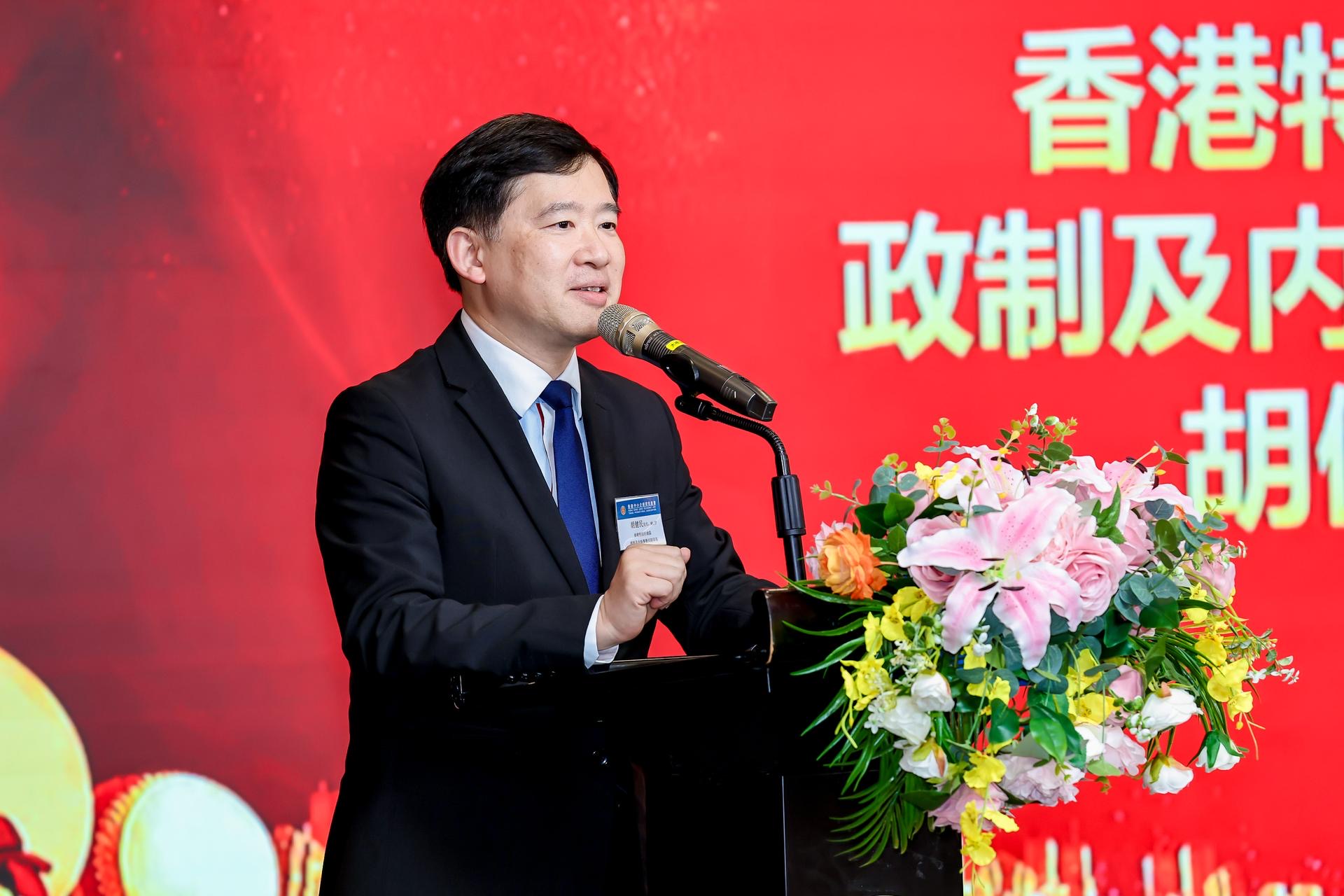 香港特別行政區政府政制及內地事務局副局長胡健民MH,JP為本次活動致辭時表示:香港擁有背靠祖國、聯通世界的獨特優勢,應善用一國兩制的特點,面對全球經濟挑戰,吸引投資和人才。他分享了對中小企業和經濟發展的看法,強調香港在國家改革開放中的重要角色,並表示對香港未來充滿信心。他還強調,香港中小企業應提升科技與產品的競爭力,迎接挑戰,保持信心,相信新的一年會更加美好!
