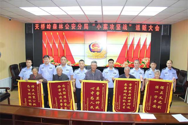 在“为民实践”我为群众办实事活动中,天桥岭森林公安分局森侦大队和青松派出所秉承解决群众“急难愁盼”问题为着力点,互相协作破获二起在诈骗案,为群众及时挽回经济损失一万三千余元,9月10日下午,局党委组织两部门民警召开返赃会议,将被骗钱款如数返还5名受骗当事人。受骗群众告诉记者,本来以为钱被骗就找不回来了,没想到办案民警快速帮我们追回了损失。5面锦旗表达了我们对公安机关的感激之情。