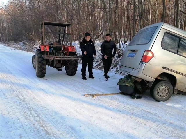 11月19日下午,响水派出所民警在开展交通勤务工作,查看雨雪天气后道路情况,当途经响水至分水岭路段时,发现一辆银灰色面包车滑进路旁沟内,路旁一名男子正来回走动查看被困车辆,副所长朴文一与民警刘晓亮立即上前询问情况,得知司机驾驶的车辆没有及时更换雪地胎,因道路结冰,没有控制好车速滑到路旁的沟里。所幸无人员受伤,民警立即对车辆开展救援,同时对道路两端的路面设置警示标志。由于刚下完雪,道路湿滑,面包车前轮已深陷沟内无法出来,民警立即联系附近群众,找来有带防滑链的拖拉机前来救援,经过半小时的救援,面包车终于被拽回道路上。经检查可以正常行驶。