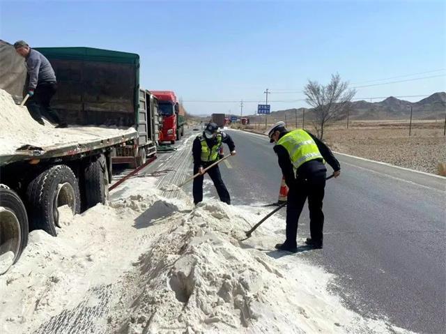 二、货车爆胎石英砂散落一地 景泰交警“排雷”清障保畅通