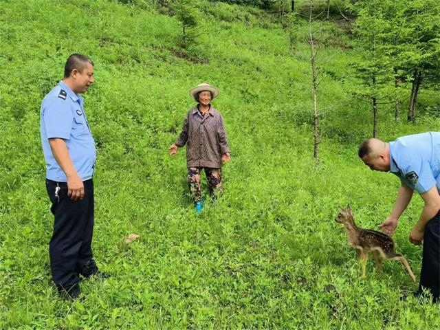 6月11日,巡警大队接到辖区群众求助称:和龙林业局四居水塔附近发现一只狍子幼崽。接到求助后,民警立即赶赴现场,发现一只狍子幼崽蜷缩在路旁,身体瑟瑟发抖,经仔细查看,狍子幼崽无明显外伤,民警判断其可能与母狍走散,长时间未进食,加之受到大雨侵袭,受到惊吓导致身体虚弱。民警决定将其带回队里,为其吹干皮毛并购买鲜奶。经民警的悉心照料,小狍子体力明显恢复,精神状态良好,活动自如。经救助站工作人员判断其已具备野外生存条件,随即,民警与求助人一同将其放归大自然。