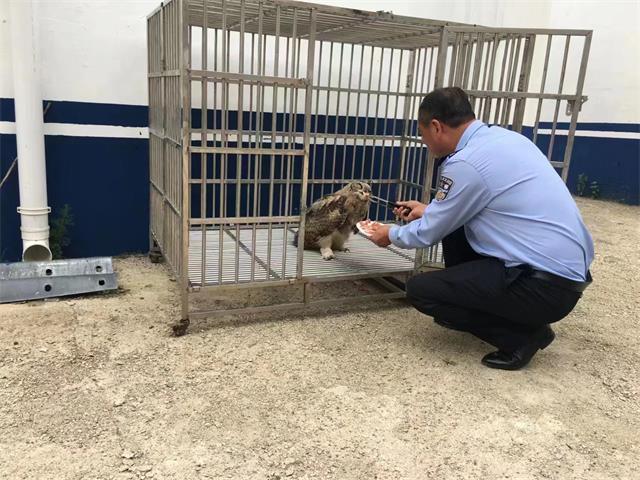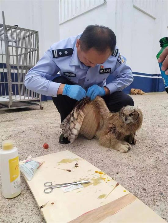 6月25日,广坪派出所民警在开展日常巡护时,发现一只疑似受伤的“猫头鹰”蹲坐在路旁。经民警仔细检查,发现其翅膀受伤、身体虚弱,暂不能飞行,民警决定将其带回派出所进行救治。到达派出所后,民警立即与野生动物救助站联系,咨询现场应急治疗处置方法,对其进行消毒治疗,并临时安置派出所做进一步观察处理。为其尽快恢复体力,民警拿来食物对其进行投喂。经民警的悉心照料,其外伤得以痊愈,恢复了野外生存能力,符合放生条件,民警将其放归大自然。