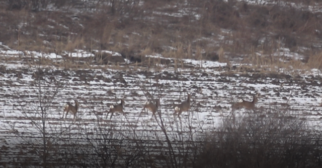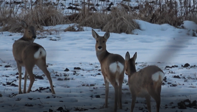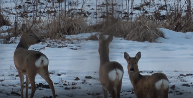 民警在响水林场的路旁的苞米地发现有六只狍子聚在这里,一起吃着地里的苞米叶,民警尝试着靠近狍子近距离拍摄,由于狍子具有警惕性,发现有人靠近,整个狍群“欢快”地跑开了。而在新华林场附近的苞米地里,一只公狍子在悠闲觅食,听到有车的声音,立即抬头观望,感到没有危险后,又低头觅食。在太阳林场附近发现的狍子则与众不同,靠路边较近的狍子听到车的声音后,立即向地中间跑去,与另外两只狍子汇合,并用蹄子踢起另一只卧在地里的狍子,停在原地伺机观望,周围究竟发生了什么事;而道另一边的一群狍子则面对地里的积雪,依靠着灵敏的嗅觉,锁定食物位置,然后用前蹄刨开积雪,寻找食物,萌态十足。而在葡萄沟林场家属院外发现的一只狍子更加有趣,呆萌的看着行人,听到车声后,撒腿就跑,看来,狍子也不是真傻。巡护民警拍到的“东北神兽”傻狍子的画面太美了,各种表情包蠢萌、蠢萌的,傻狍子号称东北第一神兽,还是比较出名的,它是一种与人类相遇率颜值较高的动物。它有一个非常容易识别的标志,臀部有一团白色的毛,好奇心特重,遇到危险时,奔跑的同时臀部的白毛炸开,形成心状,随着身体的起起伏伏消失在密林中。