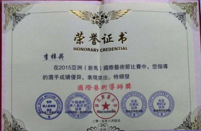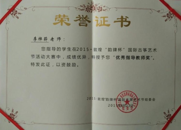 2015年,荣获“亚洲国际音乐节国际艺术导师奖”,同年获“第四届国际古筝比赛”荣获优秀指导教师奖,同年获“2015.敦煌韵牌杯国际古筝艺术节”优秀指导教师奖。