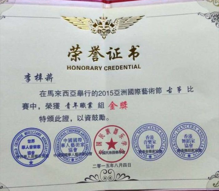 2015年,中国首位获得亚洲“国际音乐节”古筝专项比赛职业青年组金奖;