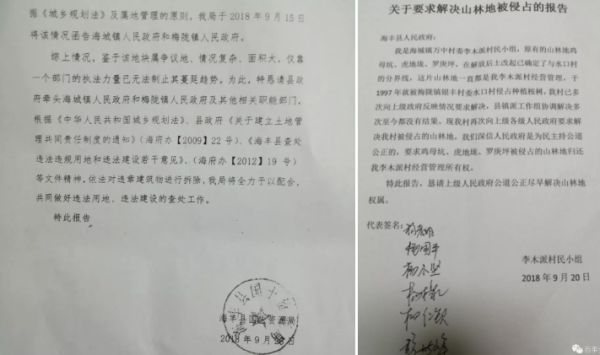 倆村村民向記者傾訴:“土地確權證,海豐縣國土資源局確認報告等證據充足,倆村的村小組和村民向上級部門上訪了十幾年,也受到過上級有關領導重視。當地政府相關部門也有做好了方案和執法人員的安排,就在準備進行執法行動時,突然就停止了,村民們感到很不解,這到底隱藏著多少不為人知的故事?此土地侵占事件已發生這麽多年了,為何在當地卻遲遲得不到落實處理?高某輝等仍然在當地稱霸壹方,這到底是出於什麽原因?倆村的村小組和村民希望政府能給他們主持公道,秉公處理。還他們被占用多年的山地土地。也希望政府嚴厲打擊破壞農村生態自然,破壞鄉村綠水青山的不法分子。