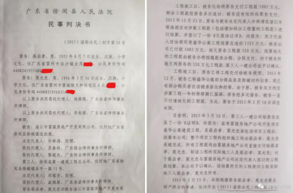 无奈之下,2015年,承建方蔡启孝,莫光忠将湛江市富骏房地产开发有限公司许林清起诉至广东省徐闻县人民法院。