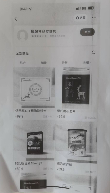 涉事的两家快手app平台网店“榔牌食点专营店”、“维爱食品专营店”公示显示:鹿心血植物饮料销售 14000 单,销售单价99.9元/单,(合计销售金额:1398600元)。鹿心血片销售14000单,一单8盒,销售单价99.9元/单,(合计销售金额:112000盒,1398600元)。熊胆明目液销售60000多单,一单10盒,销售单价99.9元/单,(合计:60 多万盒,合计销售金额5994000元)。鹿奶营养粉销售3万多单,一单6桶,销售单价69.9元/单,(合计:18万多桶,合计销售金额2097000元)。四款产品总销售额高达千万元以上,销售数量高达上百万盒(榔牌、维爱食品专营店长年涉嫌依此方式销售各类商品)。