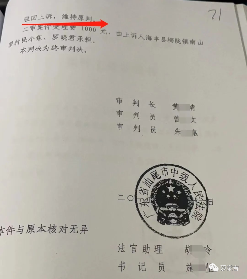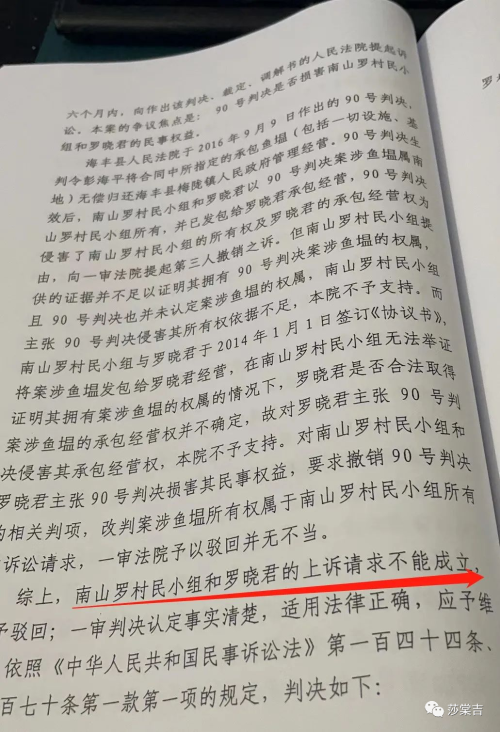 三、求助人要求恢复镇政府收回涉案鱼塭生效判决的原因。2017年7月17日,海丰县梅陇镇南山罗村民小组和非南山罗村民罗某君提起主张涉案鱼塭所有权和使用权;请求撤销原审原判生效判决的“第三人撤销之诉”。案经海丰县人民法院开庭审理並由该院审判委员会讨论决定,2018年9月3日,海丰县人民法院认定“第三人撤销之诉”主张涉案鱼塭权属的证据不足,驳回南山罗村民小组、罗某君的“第三人撤销之诉”,作出维持原审原判的民事判决[(2017)粤1521民初1479号《民事判决书》] 。南山罗村民小组、罗晓君不服上诉。2019年3月16日,汕尾市中级人民法院作出(2019)粤15民终32号《民事裁定书》,驳回南山罗村民小组、罗某君的上诉请求。确认一审判决认定事实清楚,适用法律正确,维持一审判决。