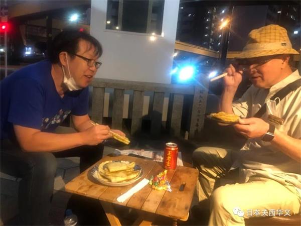 在黯淡中突然一个等身醒目的宽幅荧光屏幕闪烁在岔路口,滚动播放着中国的美食美味视频,五彩缤纷琳琅满目,引来了不少下班归途的人们驻足观看,我也好奇地凑了过去。广告屏侧上方悬挂着“大阪中华街早夜市”横幅,下面临街摆着两张简易的餐桌,一个熟悉的身影在热情同来往的过客打着招呼,没想到竟是《关西华文时报》的总编丛中笑先生。近来耳闻“大阪中华街早市”开业了,据说赵永建和王天佐两位侨领还专程来过这里,想不到今天“踏破铁鞋无觅处,得来全不费工夫”,竟让我撞到了。