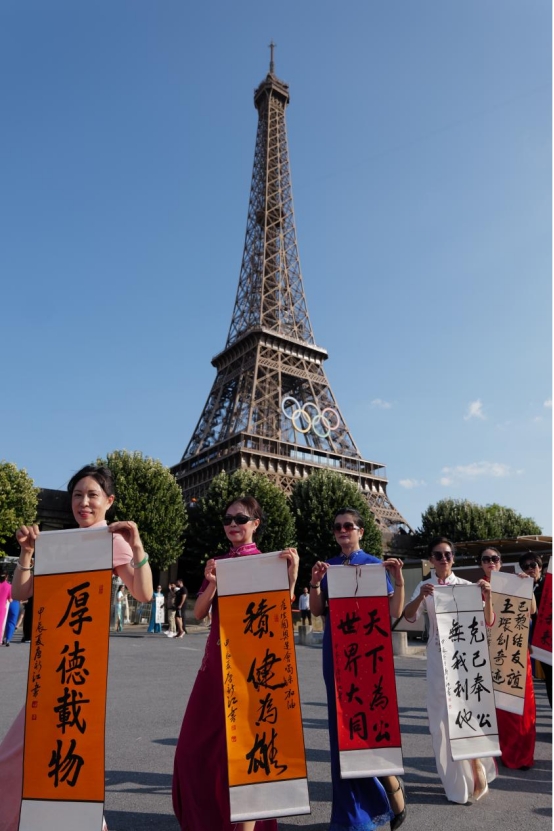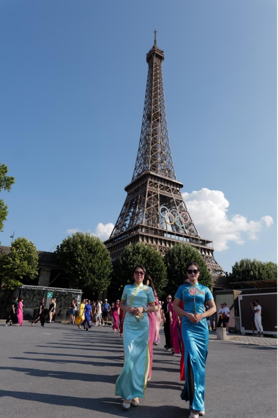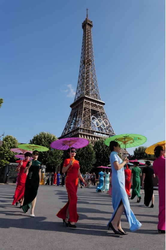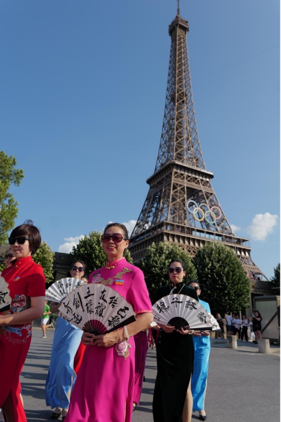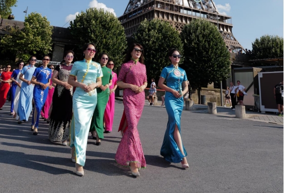 近日,50多位中华雷锋志愿者在法国巴黎埃菲尔铁塔下举办了一场中国旗袍秀。她们身穿旗袍,手持书写着“敏而好学”、“温故知新”、“己所不欲,勿施于人”等《论语》中经典名句的折扇和中国卷轴,在向世界展示中式旗袍美的同时,也讲述了中国传统文化中所体现的儒家思想与价值观。这场行走的中国文化秀引来现场外国游客围观、拍照和纷纷点赞。