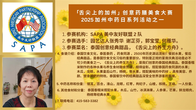 来自SAPA美中友好联盟2队,园艺达人张秀华 谢芷芬,郭宝莹,何雁华创意制作的泰国皇族经典甜品,《舌尖上的养生方舟》荣获优秀奖是泰国饮食文化,泰医泰药,药食同源的结晶。 泰医泰药具有2500年的深厚历史! 餐前水果,餐后经典甜品,是泰国饮食文化习俗的重要部分。 特别是正规的宴席庆典活动是必不可少的美食之一。 《舌尖上的养生方舟》,是她们创意的泰国经典甜品。 泰国香糯米各种水果与中药泰药养生食材融会贯通,相得益彰。 搭配泰国药食同源的水果; 木瓜,龙眼,水果皇后山竹,杨桃,等水果具有美容、养颜、塑身减肥的特效。 图片提供:Gloria Wang,Tungfai Zhang