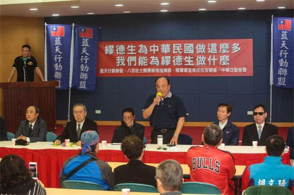 藍天行動聯盟等泛藍團體今(1)日舉行記者會,替參與年金改革抗爭而不慎墜樓重傷的退役上校繆德生祈福。現場不滿情緒高漲,數度高喊「亮劍」,聯盟主席武之璋宣布,將成為「革命團體」,「我們要用革命的手段、各種手段,提前推翻這個偽政府!」