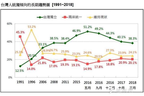 支持台獨的人從2016 年的51.2%一路下滑到2018 年3 月的38.3%