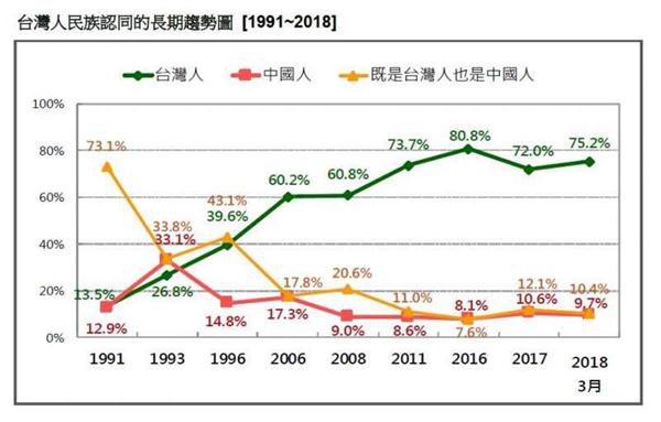台灣當前民族認同的狀態為何?台灣民意基金會延續1991 年台大胡佛教授所領導的「二屆國大代表研究」的傳統,問:「在台灣,有人自認為自己是中國人,也有人自認為是台灣人,請問您認為自己是台灣人還是中國人,或是您有其他的想法?」結果顯示,75.2%自認為自己是台灣人,9.7%自認為自己是中國人,10.4%自認為自己既是台灣人也是中國人,4.8%沒意見、不知道和拒答。換言之,在2018 年三月的台灣,二十歲以上的台灣成年人當中,有四分之三的人自認為是台灣人,一成左右的人自認為自己是中國人,另外一成的人自認為既是台灣人也是中國人。若和最近一次(2017/8)的全國性調查比較,可以清楚的發現,台灣認同者上升了3.2 個百分點,中國認同者略降0.9 個百分點,台灣與中國雙重認同者則略降1.7 個百分點。游盈表示,這再度顯示台灣認同在台灣已經是一個相當普遍且穩定的日常現象。