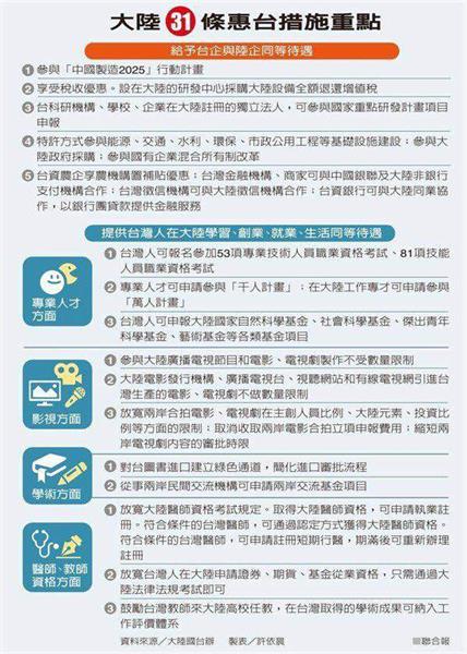 大陸2月祭出惠台31項政策後,廈門市率先推出60項配套措施,進一步深化廈台經濟社會文化交流合作,磁吸學生及專業人才。包括每年為台灣人提供至少5000個就業和實習機會,且與當地人民享有相同的就業及見習補貼。碩士學歷以上、工作滿一年後補貼人民幣3萬元(約台幣14萬),博士補貼人民幣5萬元(約台幣23萬)。延攬台灣特聘專家,特優人才每年給30萬人民幣(約台幣140萬),最高列150萬(約台幣700萬)補助。甚至提供減免5項喪葬服務費,由生到死無所不包。