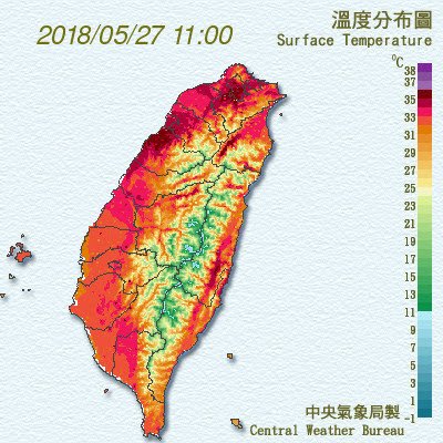 中央氣象局預報員陳伊秀:「今明兩天,受到太平洋高壓,勢力較強,加上中國的熱源,隨著高層西風也往台灣吹,所以高溫部分,西半部東北部甚至東南部,都來到35度以上,尤其大台北地區,我們預估高溫也有達到37度以上,不排除溫度可能更高一點。」