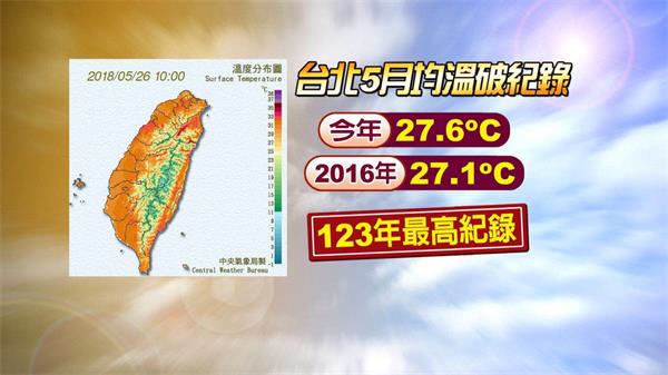 不只週末熱,今年5月動不動就飆上35度,台北站5月均溫高達27.6度,打破2016年紀錄,成為123年來,最熱的5月,全台13站均溫,也很高,逼近27.2度,成為史上第二熱,還好氣象局表示,下週一就有鋒面報到,可以稍稍降溫。