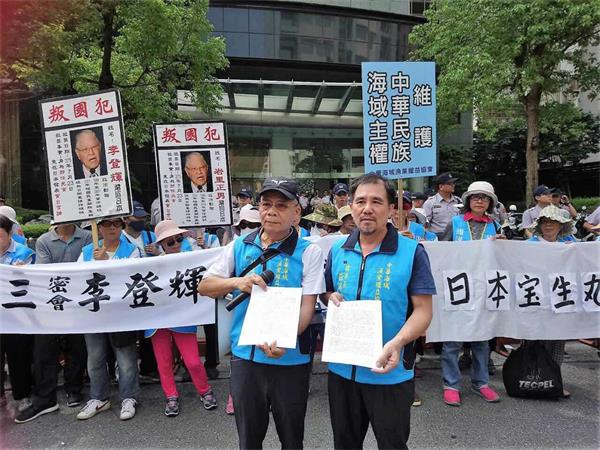 中華海域漁權協會理事長莊苓宗、副理事長陸愛華上午率200多位民眾抗議,中華愛國同心會也派員加入聲援。他們拉起“安倍晉三密會李登輝出賣台灣”、“日本寶生丸21號船是海盜行為”的布條,手持“叛國犯-李登輝”,一起高呼口號表達抗議。