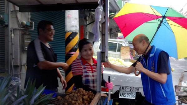 韓國瑜到橋頭老街拜票時,下起大雨,他還是穿起輕便雨衣向攤商拉票,行經余登發舊居,特地停下腳步對台灣早期黨外民主的前輩致意。