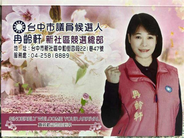 冉齡軒小姐今天在台中新社正式成立競選總部成立大會:致詞各位長官、貴賓、新社以及齡軒四選區所有敬愛的鄉親大家好!感謝長官致詞勉勵,齡軒與團隊競選總部決定在新社前鄉長李光銘、夫人余寶錞(是自己的大哥、大嫂,光國是三哥)感謝李家無條件提供這麼好的場地,讓齡軒成立新社競選總部,再次感謝!也感謝廖國泰里長(擔任幾屆里長,目前還是大南里長候選人,百忙之中,擔任齡軒新社競選總部總幹事)同時感謝長期支持齡軒到國外讀書與參選議員服務地方鄉親(我的先生邱裕明)最重要感謝再感謝是各位支持冉齡軒ㄟ鄉親,因為您們的肯定、愛護、疼惜,給了冉齡軒再次參選台中市議員機會。
