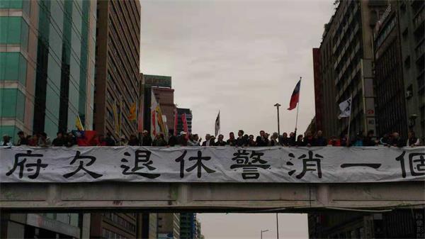 還我公道標語日前又被拆︱退休警消第五度懸掛巨幅布條向蔡政府爭權益