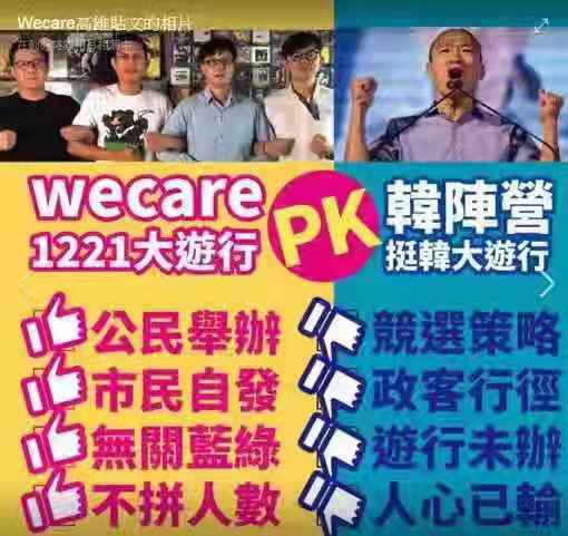 罷韓「We Care高雄大遊行」在南高雄進行,是由公民割草行動、WeCare高雄、台灣基進黨等團體合辦,以高市府前文化局局長尹立為對外發言人,主要規劃與實際操盤的是去年11月舉辦「We Care大氣球遊行」的團隊,並有部分前市府團隊核心成員協助活動辦理。