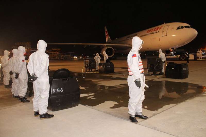 专案小组人员在专机未抵达前,就已换上防护衣、口罩等全副武装在机棚待命,等到专机落地后,随即推至台湾飞机维修公司机棚,当飞机进入后也立即关起大门维护机上乘客隐私,陆军司令部三三化学兵群也马上进行人员与机具等消毒任务。